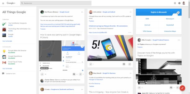Sur ces pages, vous retrouvez une liste de communautés et de collections sur la gauche. Au centre sont listées les publications jugées les plus intéressantes par Google. Vous pouvez passer d’un sujet à un autre grâce à un encart situé à droite. Actuellement, impossible d’accéder à la liste des personnes associées à ces centres d’intérêt, mais cela ne saurait tarder.