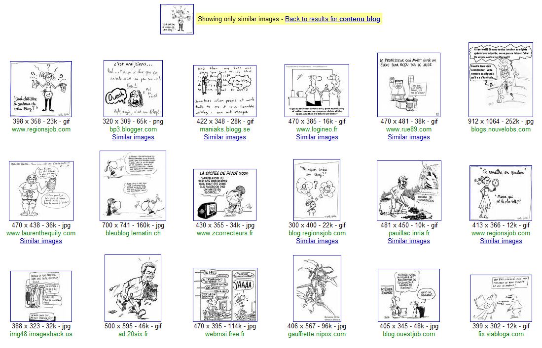 Dans la famille recherche d’images similaires, on connaissait déjà TinEye, que je vous avais présenté il y a quelques mois. Dans un style proche, ColorpickR permet de faire des recherches sur FlickR en fonction d’une couleur prédéterminée. C’est au tour de Google de se lancer sur ce créneau avec un mélange des deux précédents concepts. Encore en cours de développement, le service est disponible sur Google labs. Lancez une recherche d’images classique, vous verrez apparaitre sous certaines photos un lien « similar« . Ce dernier renvoie sur des photos aux formes et aux couleurs proches. On perd donc (un peu) de l’intérêt de TinEye, qui est de découvrir les sites ayant copié une photo. Cela peut tout de même se révéler utile, la preuve avec deux exemples.