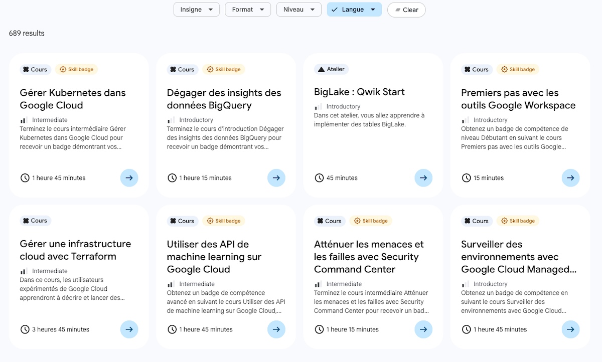 Pensée pour un large public, la plateforme s’adresse aussi bien aux étudiants qu’aux développeurs confirmés ou aux responsables d’équipe, précise Google. Parmi les parcours proposés, on retrouve par exemple un cours d’introduction AI Essentials, des préparations aux certifications Google Cloud, des laboratoires pratiques encadrés par des outils comme Gemini Code Assist, ainsi que des formats courts baptisés AI Boost Bites, pensés pour un apprentissage rapide et ciblé. Au sein de ce catalogue, des filtres permettent notamment de bénéficier de cours en français, pour les utilisateurs et utilisatrices non anglophones.