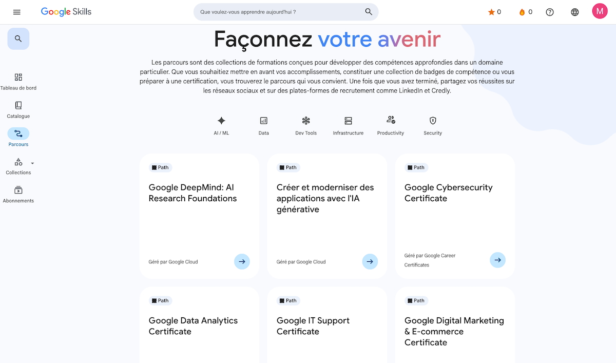 Google Skills se présente comme un hub centralisé pour l’apprentissage technologique, en rassemblant près de 3 000 cours, tout comme des « laboratoires pratiques » et des « parcours de certification ». L’ensemble agrège des contenus issus de plusieurs divisions du groupe : Google Cloud, Google DeepMind, Grow with Google et Google for Education. La firme propose ainsi une porte d’entrée et un catalogue uniques pour développer des compétences techniques, qu’il s’agisse de découvrir l’intelligence artificielle ou de valider une expertise déjà acquise.