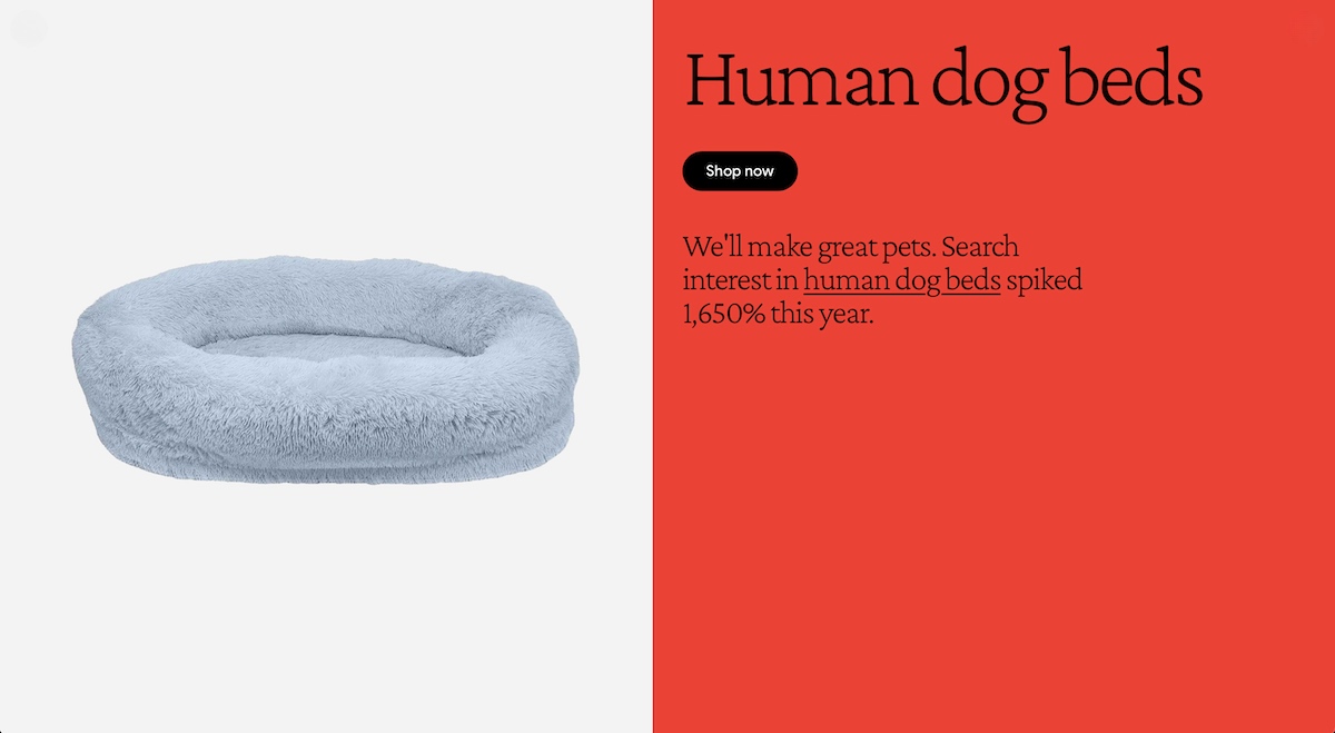 - Le lit pour chien pour humain : qui n’a jamais rêvé de se coucher confortablement dans un panier pour chien ? Nous, pas vraiment, mais les internautes semblent particulièrement s’intéresser à ces modèles de paniers pour chien à taille humaine… +1650 % de recherches !