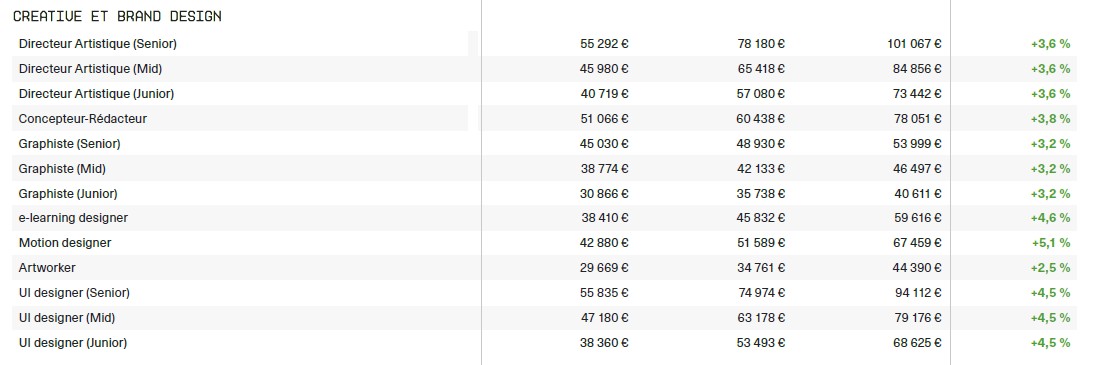 - Product designer (confirmé) : salaire médian de 49 400 € en moyenne, soit +5 % en un an.