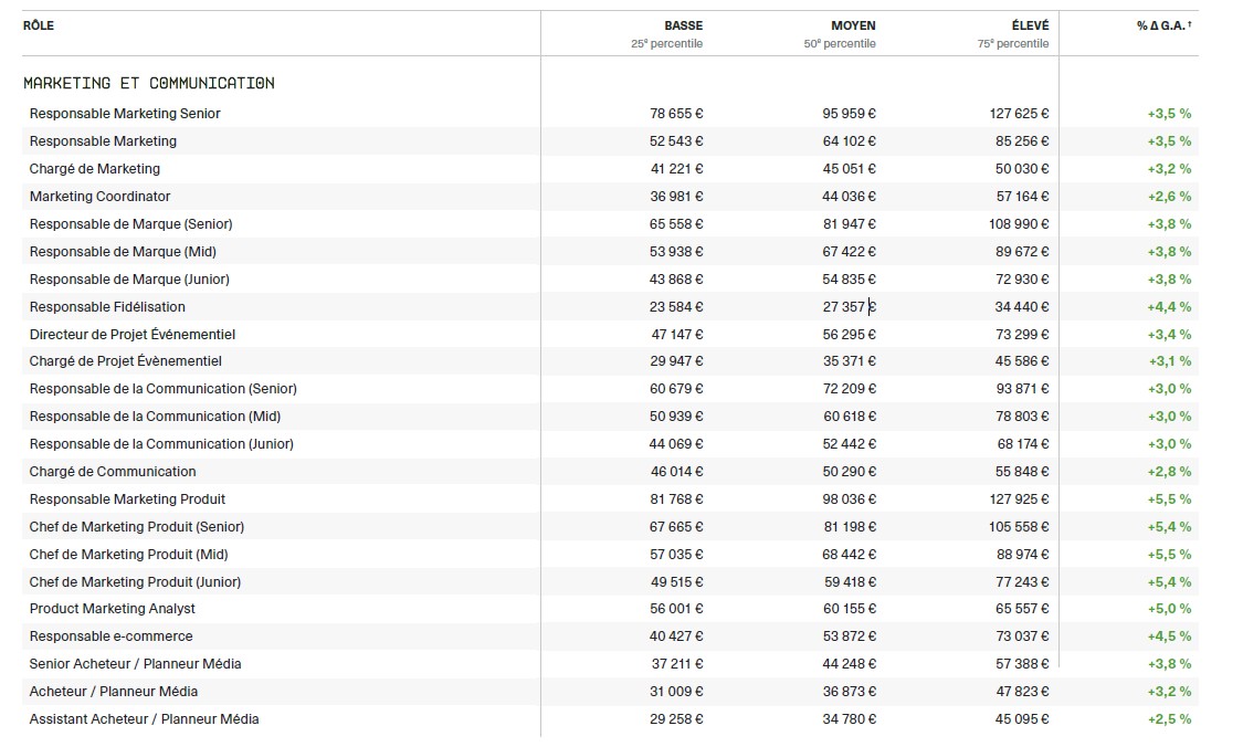 - Responsable du contenu marketing : salaire médian de 47 679 € en moyenne, soit +4,1 % en un an.