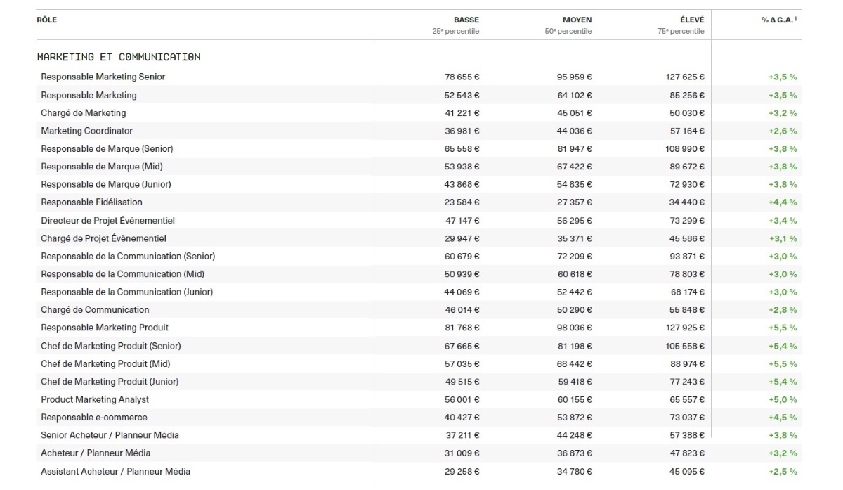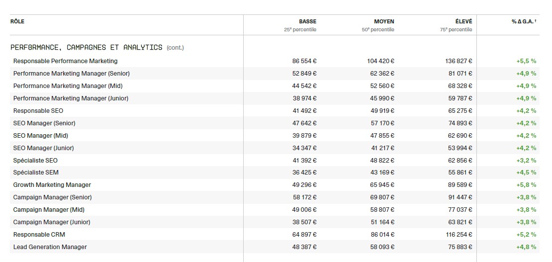 - Responsable performance marketing : salaire médian de 104 420 € en moyenne, soit +5,5 % en un an.