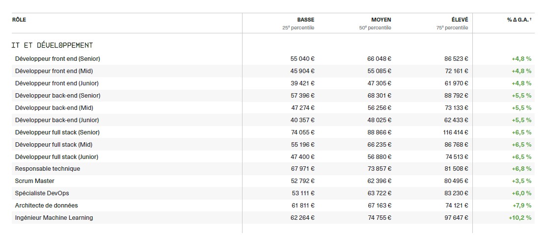 - Développeur back-end (senior) : salaire médian de 68 301 € en moyenne, soit +5,5 % en un an.