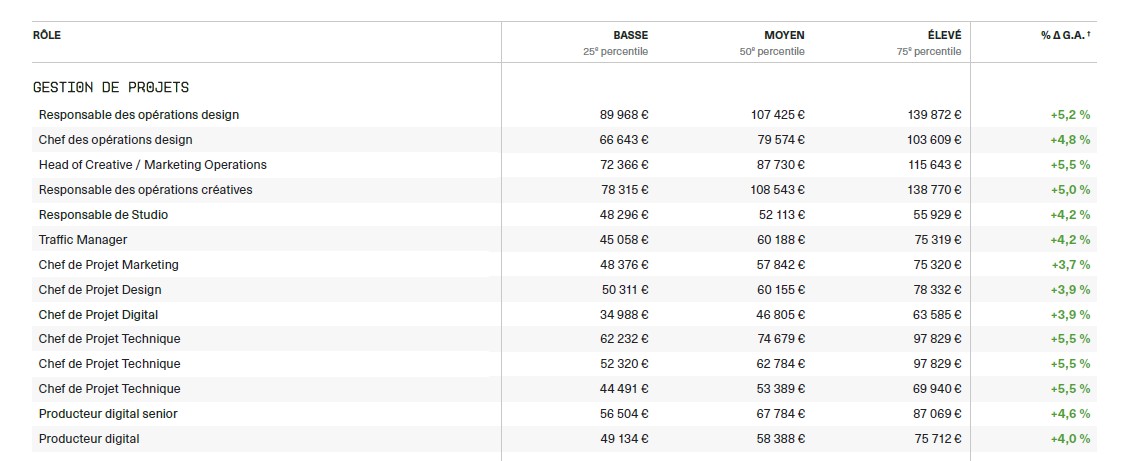 - Chef de projet digital : salaire médian de 46 805 € en moyenne, soit +3,9 % en un an.