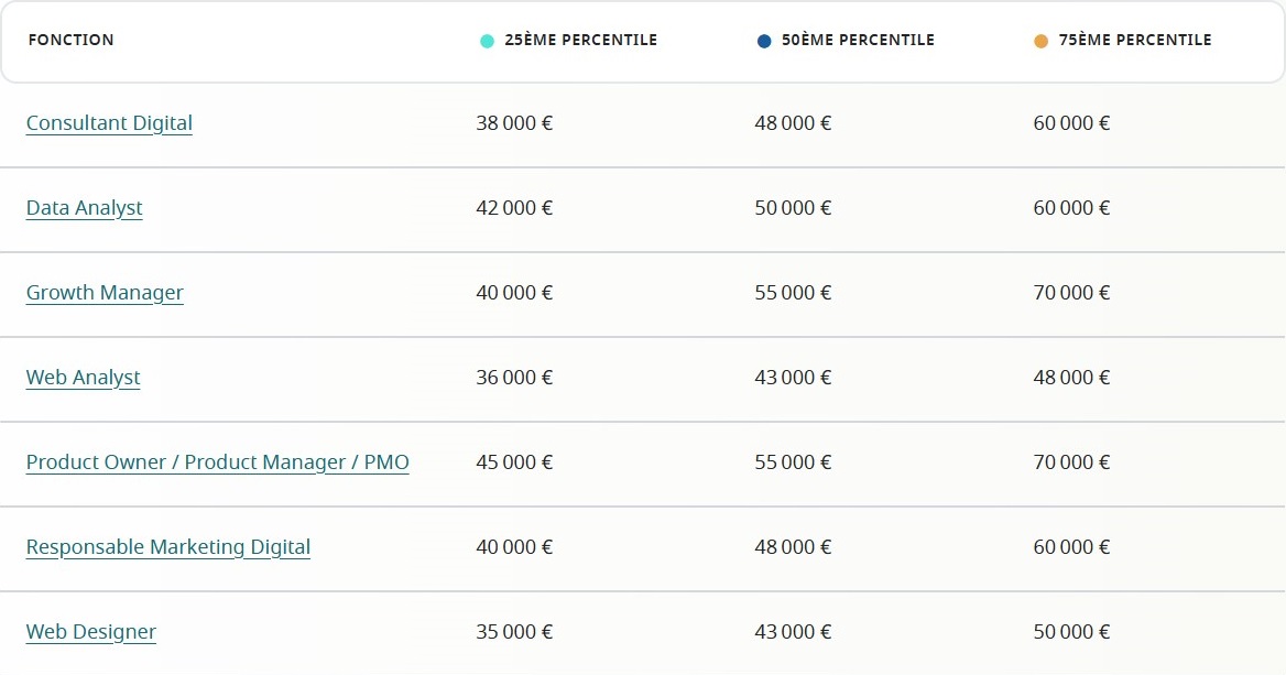 - Consultant digital : 38 000 € (25e percentile), 48 000 € (50e percentile) et 60 000 € (75e percentile).