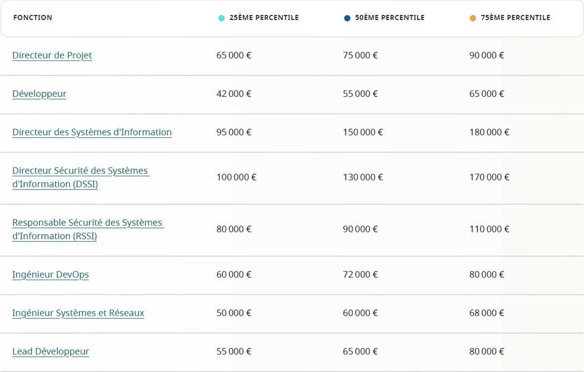 - Directeur des systèmes d’information (DSI) : 95 000 € (25e percentile), 150 000 € (50e percentile) et 180 000 € (75e percentile).