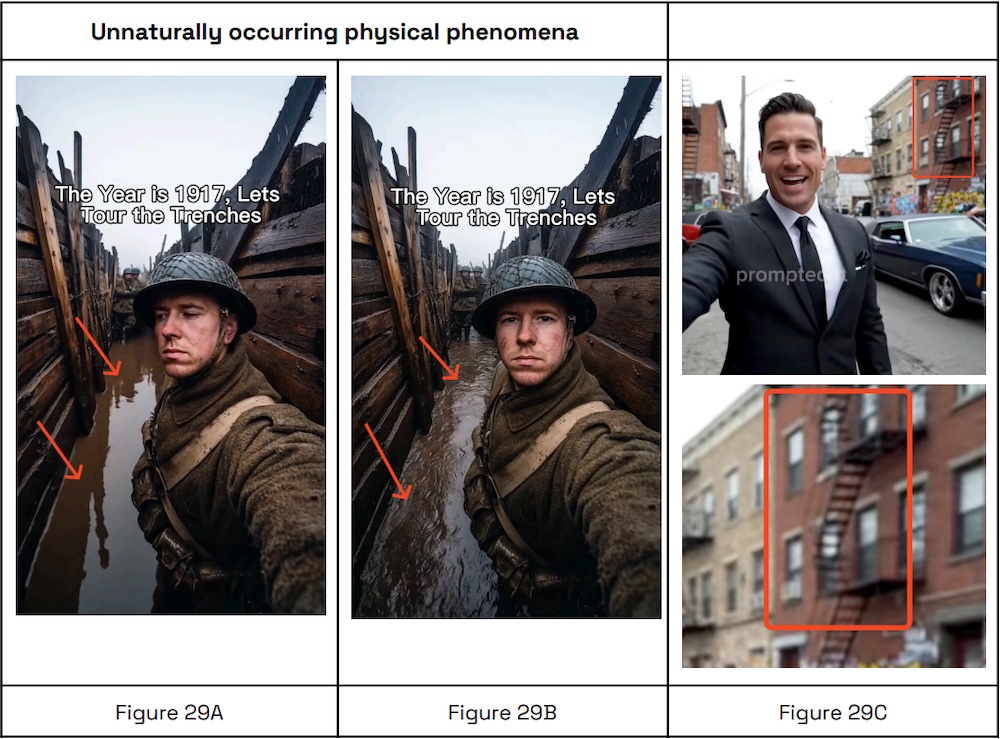 Les éléments naturels posent également problème. L’eau peut rester étrangement immobile puis devenir brusquement agitée d’une image à l’autre. Les vêtements peuvent ne pas bouger alors qu’un vent fort fait voler les cheveux. La fumée ou la vapeur se déplace parfois selon des trajectoires improbables.
