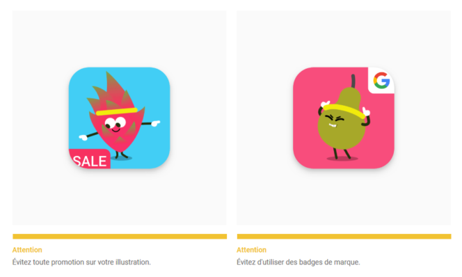 Si les badges ne sont pas explicitement interdits, Google déconseille fortement d’en faire usage sur les icônes, que ce soit pour mettre en avant une promotion ou une marque.