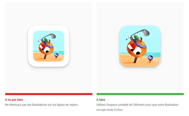 Google applique des angles arrondis de manière dynamique en fonction des différentes interfaces utilisateurs rencontrées. Dans tous les cas, l’arrondi est équivalent à 20% de la taille de l’icône. Il est ainsi conseillé de remplir tout l’élément avec votre illustration.