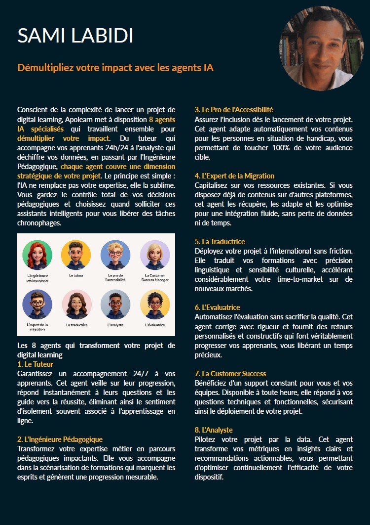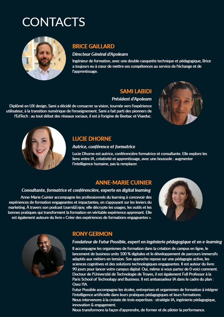 Chaque expert apporte un éclairage ciblé sur un levier clé de réussite : choix et déploiement d’un LMS, rôle du tutorat, conception pédagogique des parcours, intégration raisonnée de l’IA. L’ensemble dessine une vision cohérente, centrée sur l’expérience vécue par les apprenants comme par les formateurs.