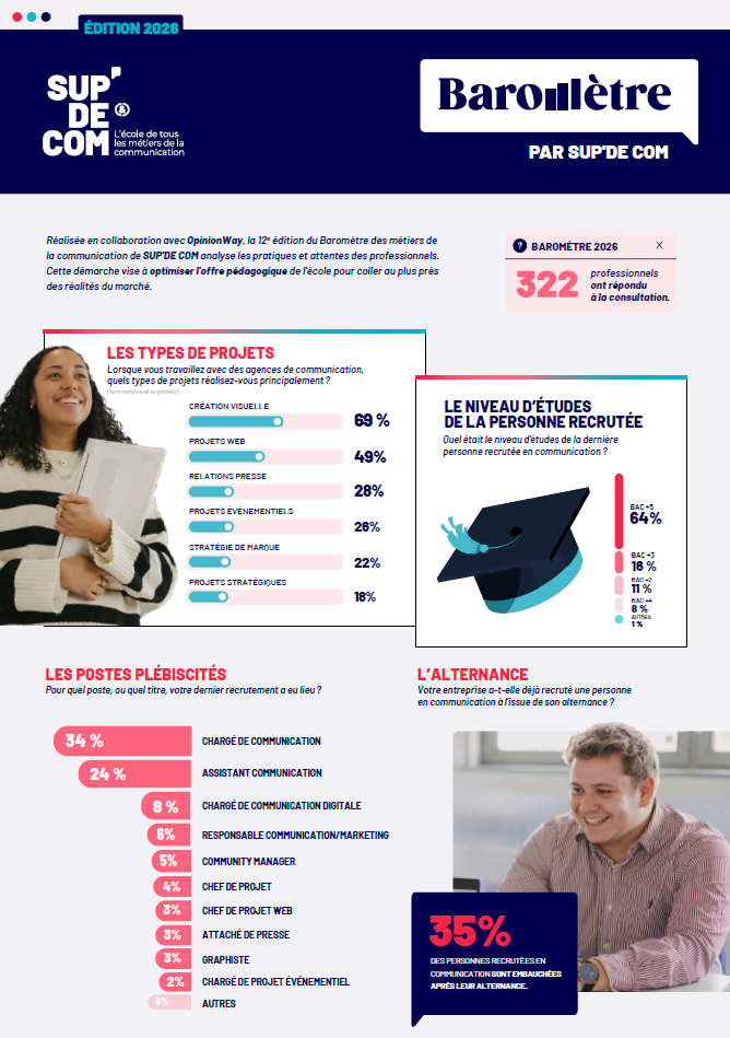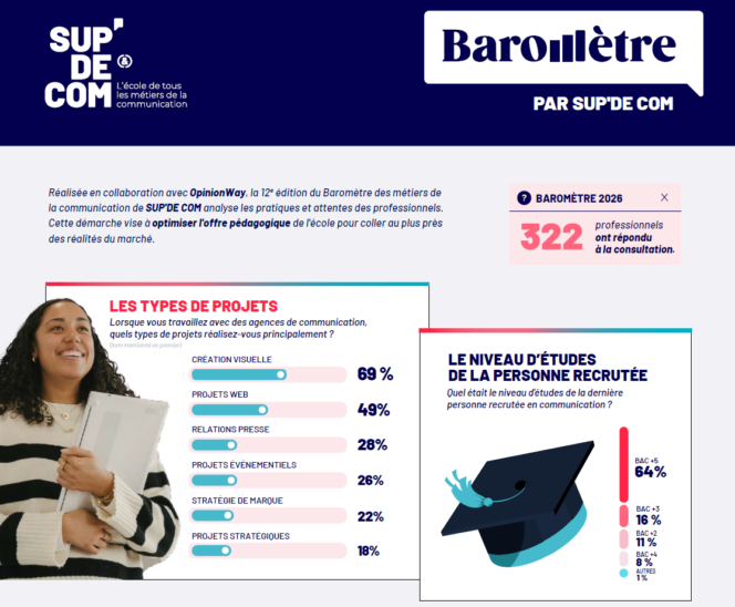 Pour cette 12e édition, SUP’DE COM a interrogé 322 professionnels en collaboration avec OpinionWay. Le baromètre révèle que 64 % des personnes recrutées sont titulaires d’un Bac+5, et que le rédactionnel s’impose comme la compétence technique la plus valorisée (18 %), devant les réseaux sociaux et la gestion de projet (17 % chacun). Du côté du savoir-être, l’esprit d’équipe arrive en tête (11 %), suivi de la créativité et du sens de l’organisation (10 % chacun). Par ailleurs, 57 % des profils recrutés sont généralistes, et 1/3 des recrutements s’effectuent en alternance — dont 35 % débouchent sur une embauche.
