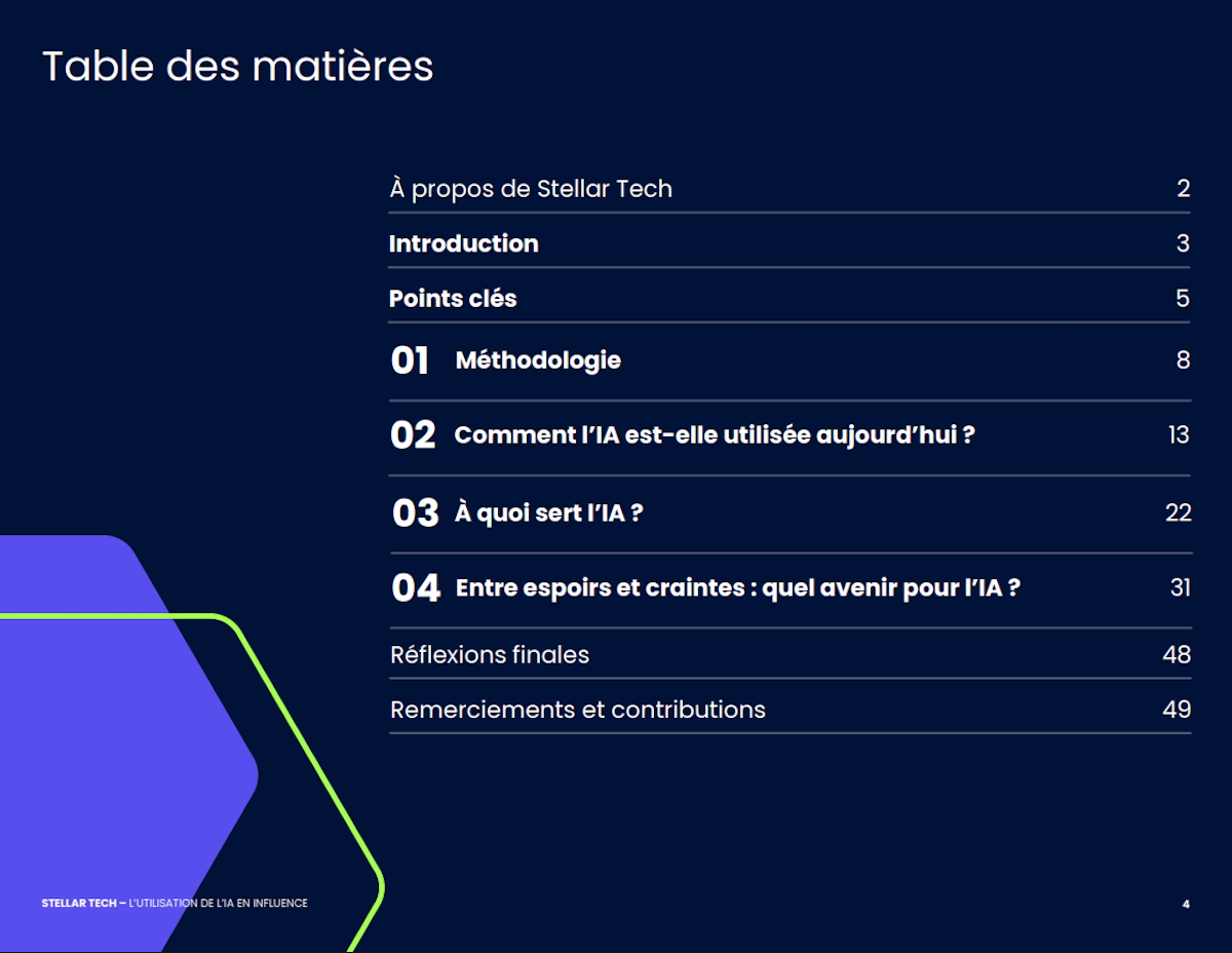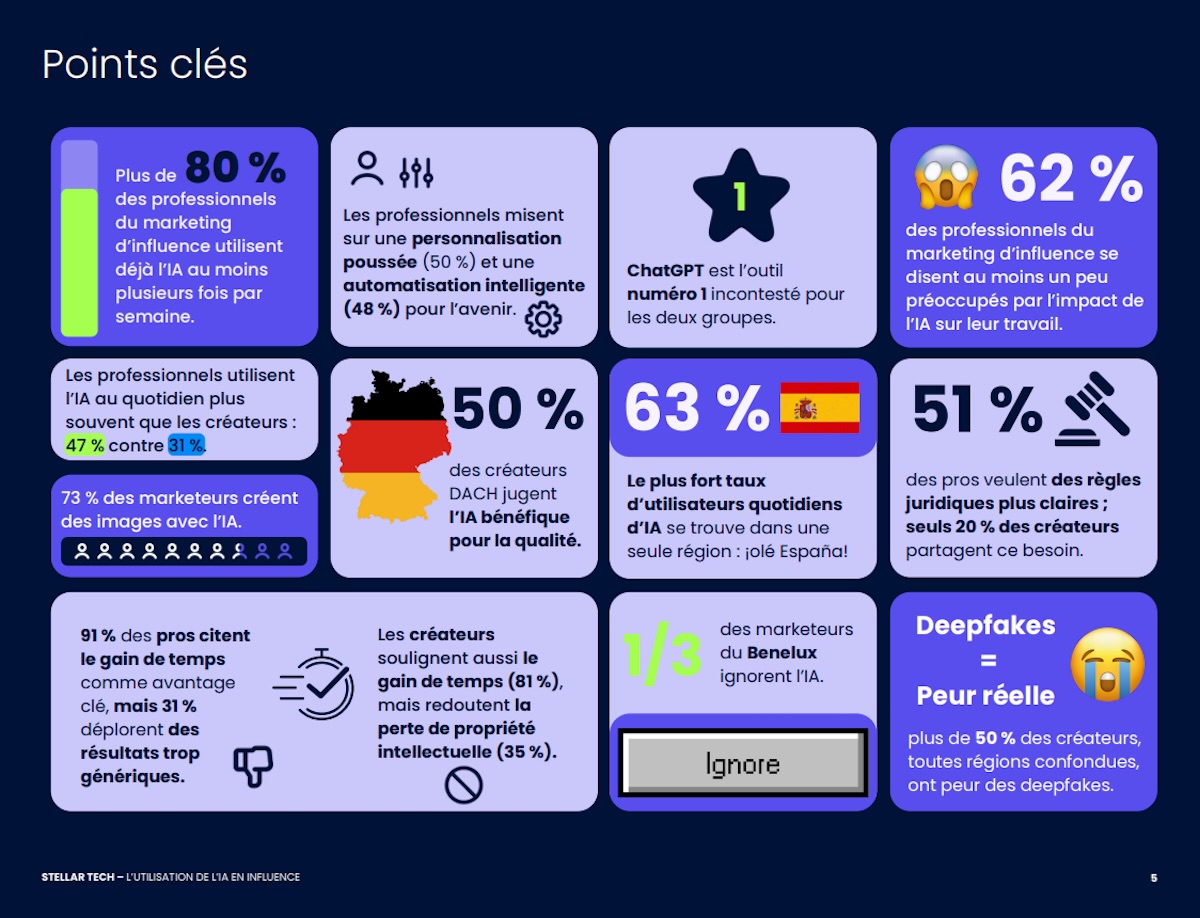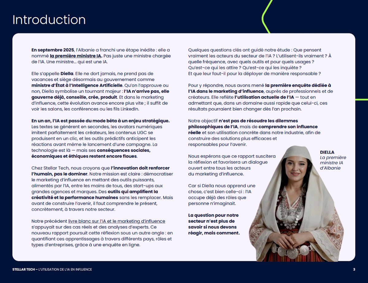 Stellar Tech met en évidence que l’IA est désormais intégrée dans l’idéation, la création de contenus, la gestion de campagnes et l’analyse de performance. L’enquête explore enfin les perceptions éthiques et juridiques associées à son usage, notamment autour de la propriété intellectuelle et de la transparence. À travers ces données, Stellar Tech cherche à documenter l’évolution d’un écosystème en mutation, où l’intelligence artificielle s’impose comme un élément structurant du marketing d’influence contemporain.