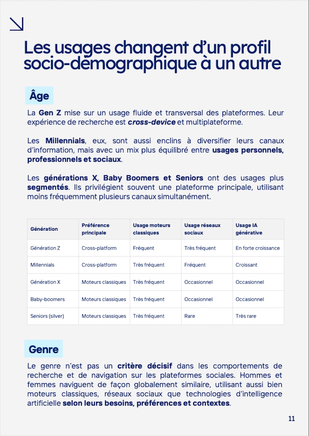Les comportements utilisateurs varient selon les profils socio-démographiques et centres d’intérêt. La Gen Z et les Millennials adoptent une approche cross-platform tandis que les générations X, Baby Boomers et Seniors privilégient une plateforme seulement. Les requêtes Asking (obtenir des conseils) ont surpassé les requêtes Doing sur ChatGPT en 2025 (51,6 % contre 34,6 %), démontrant que les usages évoluent rapidement.