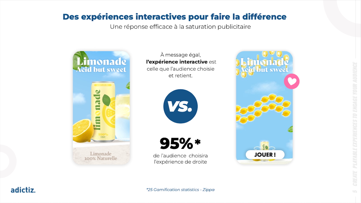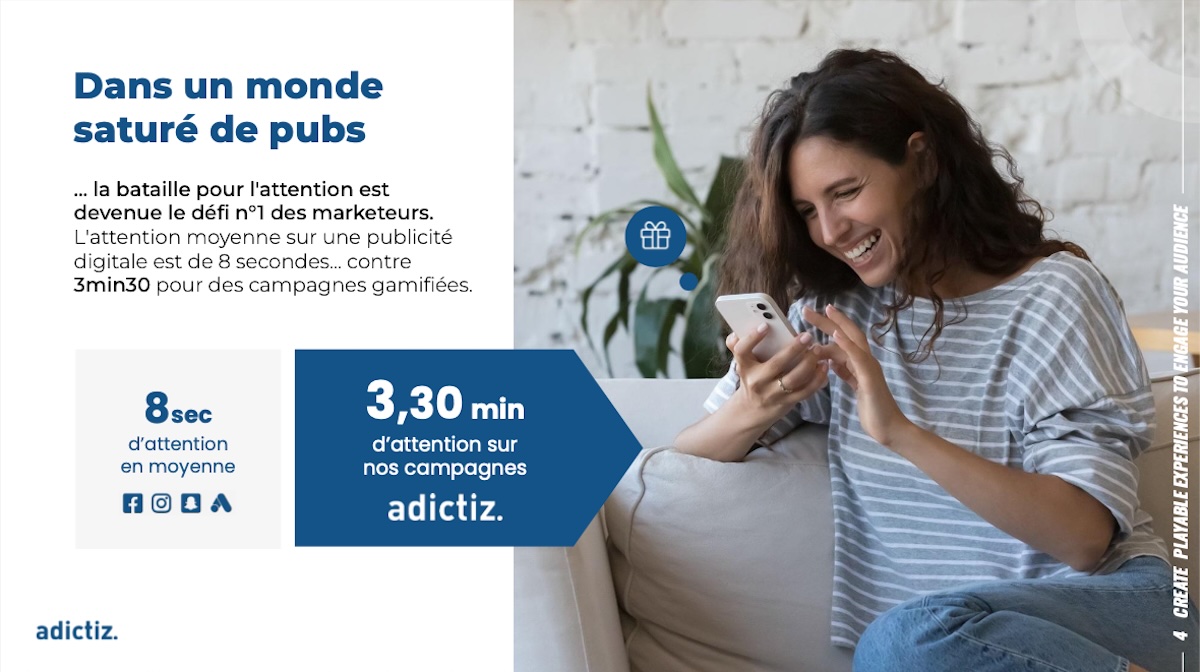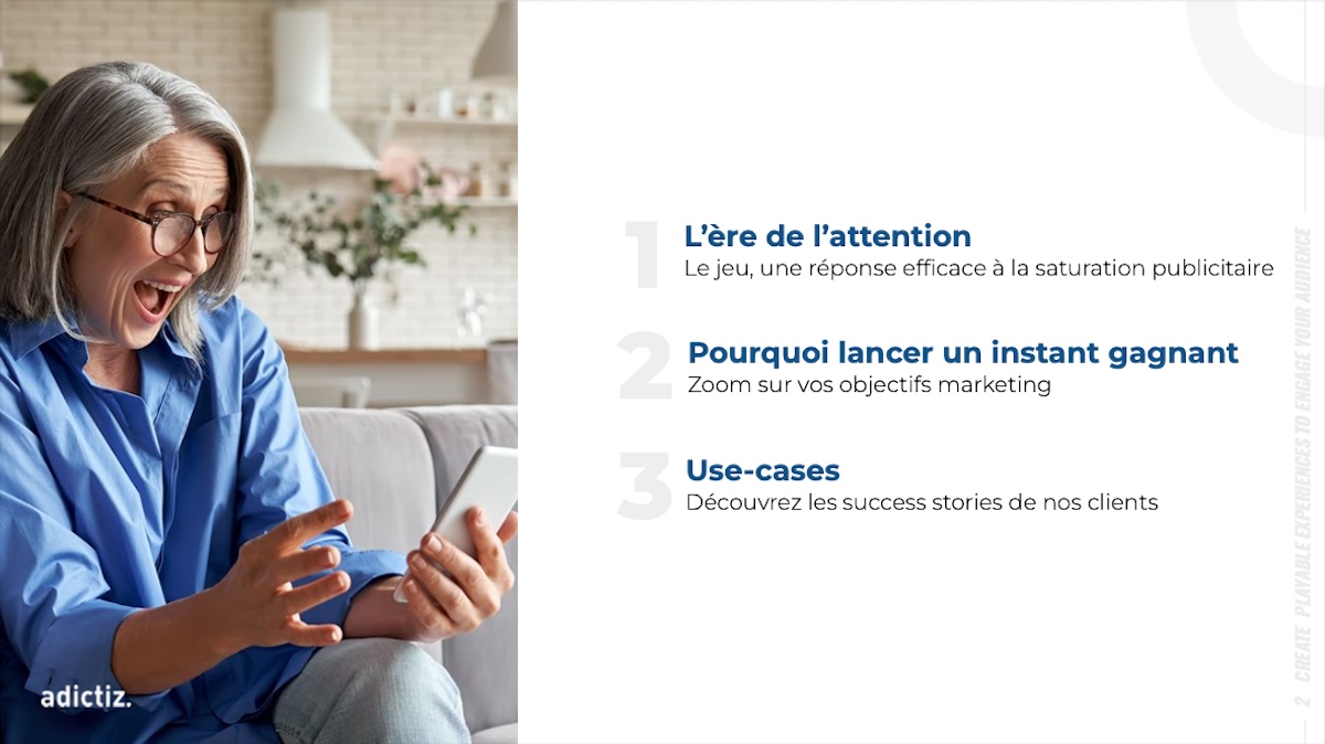 Il présente également les huit mécaniques d’instants gagnants disponibles sur la plateforme Adictiz, parmi plus de 55 mécaniques : piñata, roue de la chance, grattage, bandit manchot, grappin, flip & win, shuffler, click and win, ainsi que leur adaptabilité à cinq formats de diffusion, que sont les ads, landing page, borne en point de vente, application mobile et pop-up e-commerce.