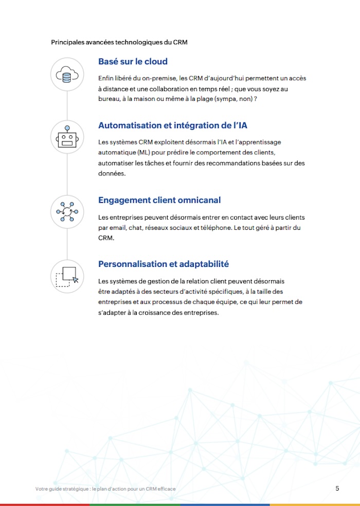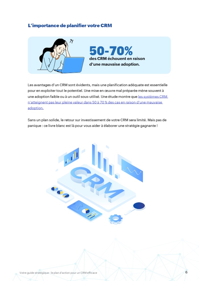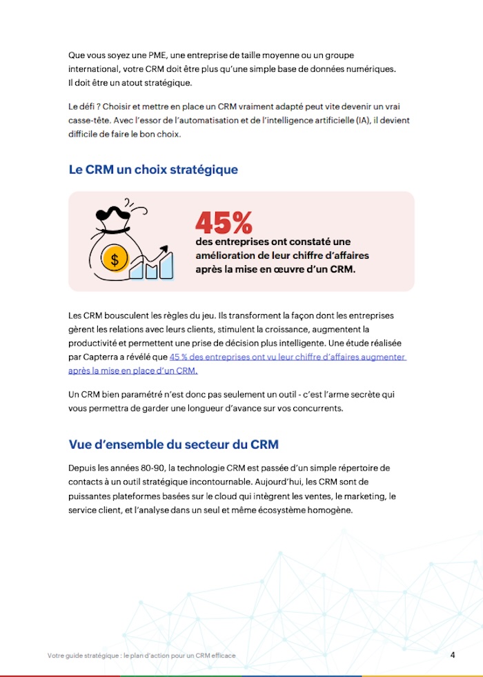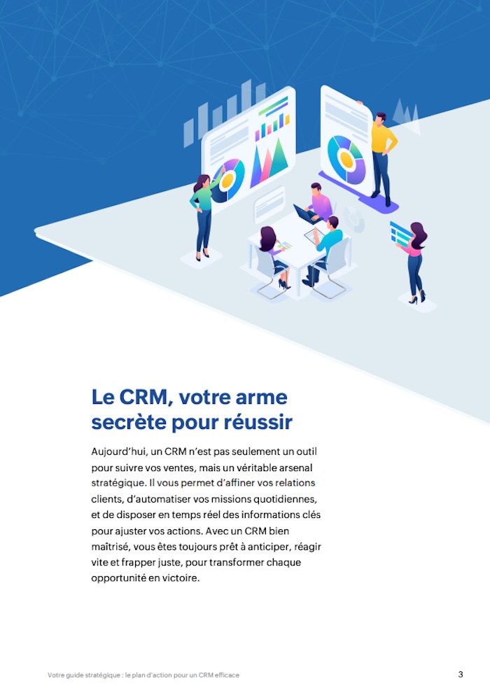 Long de 36 pages, enrichi d’insights et de conseils pratiques, ce livre blanc détaille d’abord ce qu’un CRM peut apporter à une entreprise, en examine les principaux cas d’usage par secteur, ainsi que son utilité pour les différents services internes (marketing, service client, opérations, etc.).