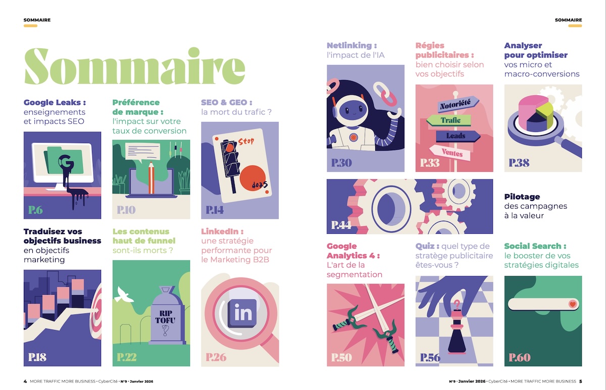 More Traffic More Business n°9, édité par CyberCité, propose une approche complète du marketing digital performant. Ce magazine aborde les nouveaux défis de la conversion dans un environnement où les parcours clients se complexifient et où les attentes évoluent rapidement. Il démontre que la performance marketing repose désormais sur la capacité à transformer les interactions en conversions solides, tout en conservant la préférence du consommateur.