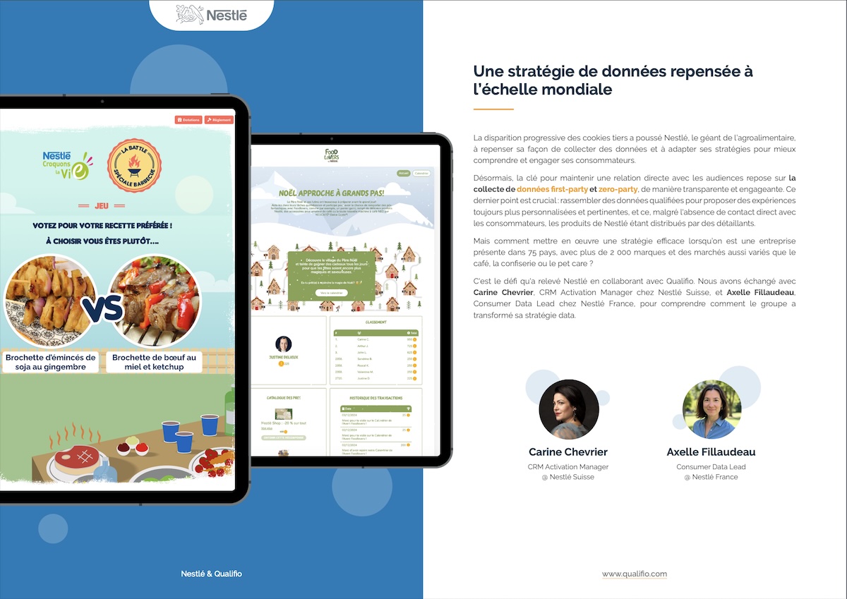 Dans ce cas client de 12 pages, Qualifio, leader européen de la collecte de données first- et zero-party par la gamification, détaille comment Nestlé, géant de l’agroalimentaire présent dans 75 pays avec plus de 2 000 marques, a transformé sa stratégie de collecte de données face à la disparition des cookies tiers. Le document s’appuie sur les témoignages de Carine Chevrier (CRM Activation Manager chez Nestlé Suisse) et Axelle Fillaudeau (Consumer Data Lead chez Nestlé France).