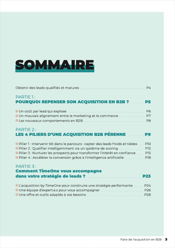 Le livre blanc se conclut par une présentation de l’expertise TimeOne en acquisition B2B, incluant leur référentiel data propriétaire (12 millions de SIRETS, 14 millions de contacts B2B renseignés), leur équipe dédiée d’une vingtaine d’experts, et leur solution ProspectLab qui combine stratégie leadgen, scoring IA, nurturing automation et qualification conversationnelle.