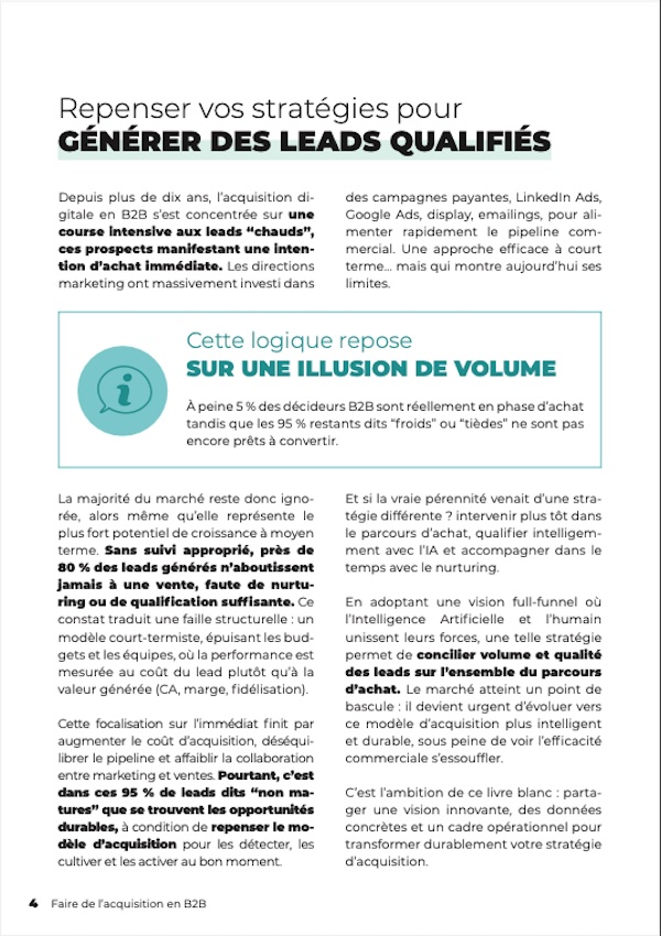 Dans ce livre blanc de 30 pages, TimeOne analyse les limites du modèle d’acquisition B2B actuel, centré sur la course aux leads chauds, et propose une approche structurée autour de quatre piliers essentiels. Le document s’ouvre sur un constat : le coût par lead (CPL) a augmenté de 25 % en trois ans, 80 % des leads générés n’aboutissent jamais à une vente faute de nurturing, et seulement 5 % des décideurs B2B sont réellement en phase d’achat à un instant T.