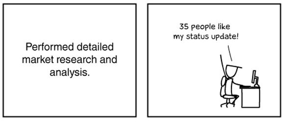 - CV : « J’ai réalisé des analyses et des recherches détaillées du marché »/ Réalité : « 35 personnes aiment ma publication ! »