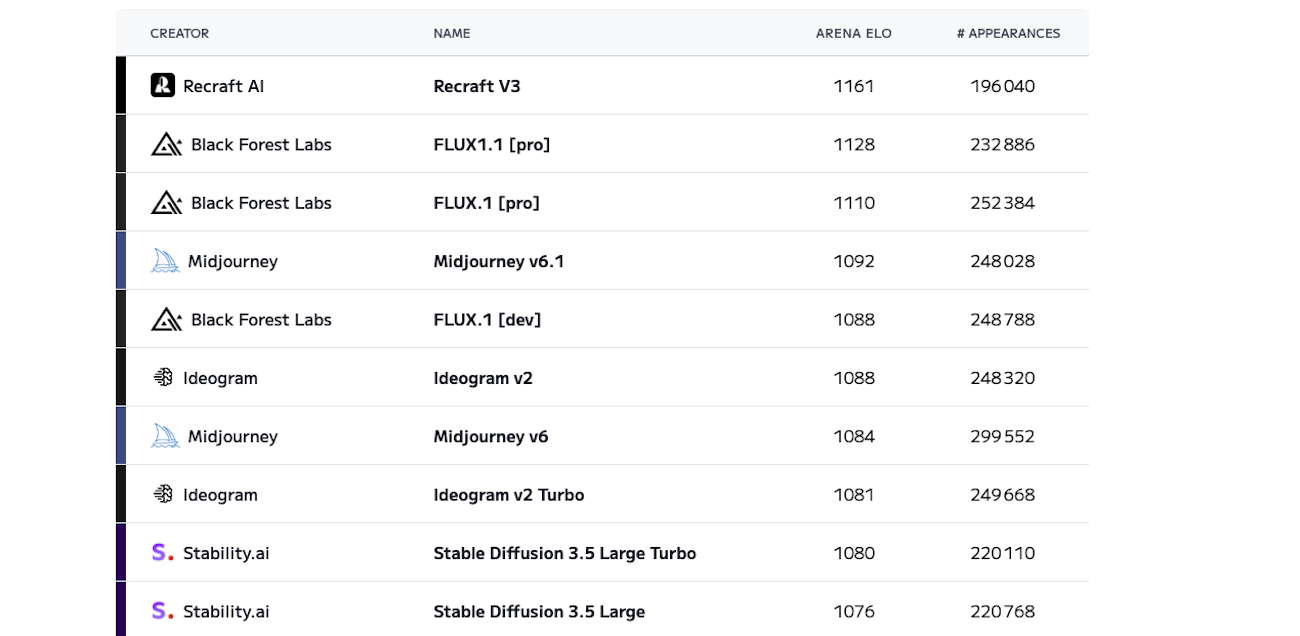 Recraft consolide sa position de leader de la Text to Image Arena. La troisième version de son modèle continue de surpasser les technologies de Black Forest Labs et Midjourney.