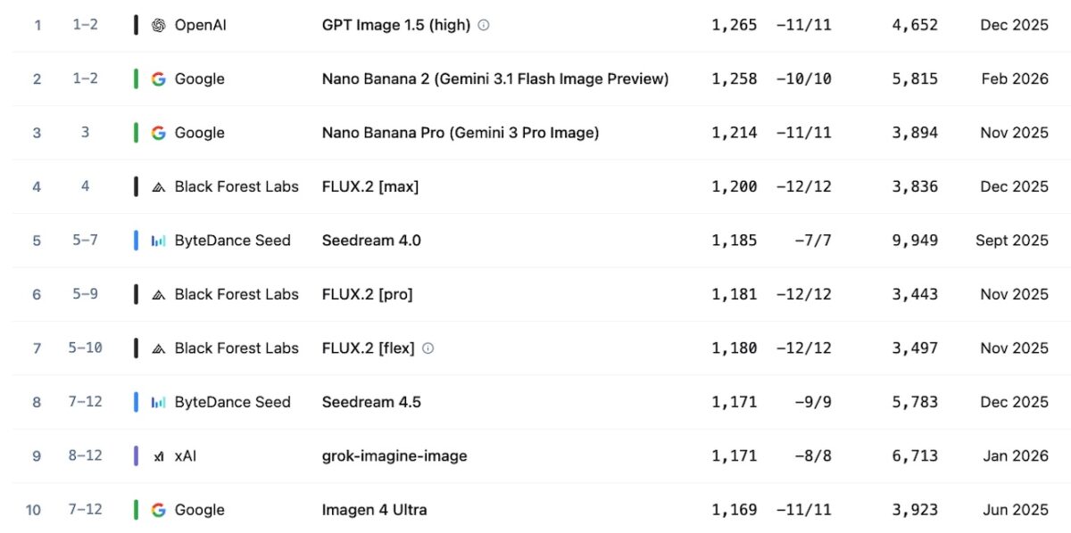 Déployé il y a tout juste un mois, Nano Banana 2 n’est pas parvenu à détrôner GPT Image 1.5 de la première position d’un classement dominé par une poignée d’acteurs.