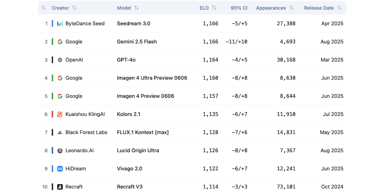 Voici les modèles les mieux notés en août 2025, selon la Text to Image Arena d’Artificial Analysis :