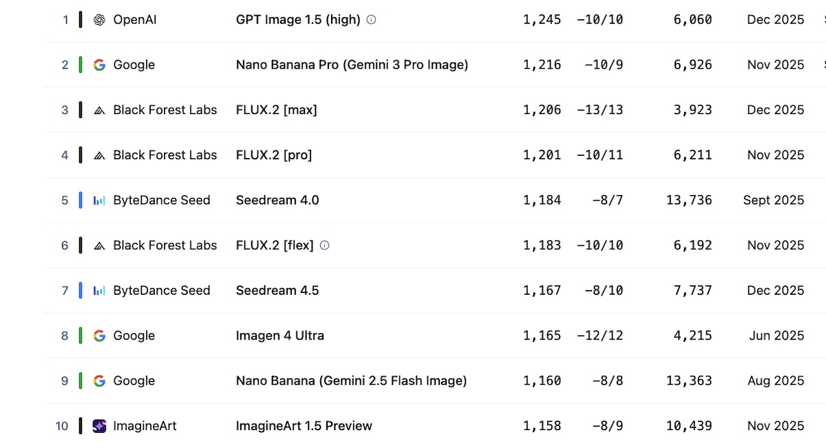 OpenAI et Google dominent toujours le domaine de la génération d’images. C’est ce que révèle la version actualisée de la Text-to-Image Arena, un classement établi par l’organisme indépendant Artificial Analysis à partir des votes des utilisateurs. Avec GPT Image 1.5 et Nano Banana Pro, déployés il y a quelques semaines, les deux géants maintiennent une courte avance sur leurs principaux concurrents, notamment Black Forest Labs et ByteDance.