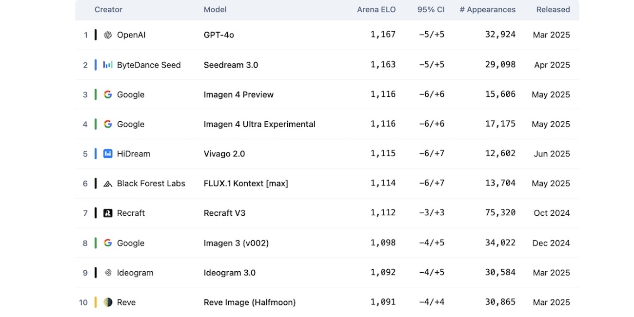 Comme en juin, le modèle d’OpenAI devance Seedream 3.0, un modèle conçu par ByteDance, la maison-mère de TikTok, et Imagen 4 Preview, confortablement installé sur le podium depuis mai. Longtemps à la traîne dans le domaine de la génération d’images, Google parvient désormais à placer trois itérations d’Imagen dans le top 10, aux 3e, 4e, et 8e places.