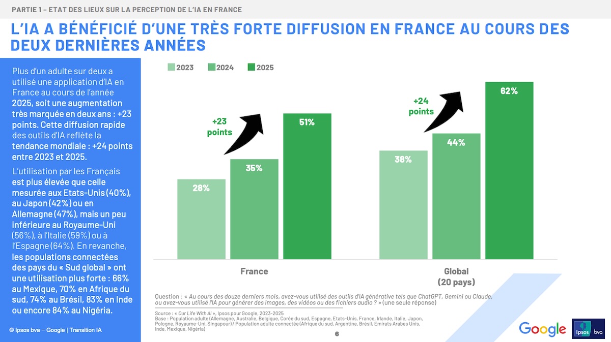 Alors que les études récentes confirment l’accélération de l’adoption de l’IA en France, le rapport commandé par Google en précise l’ampleur. 51 % des adultes français ont utilisé une application d’IA en 2025, soit une progression de 23 points en deux ans (voir image de une). Mais cette diffusion ne s’accompagne pas d’une compréhension équivalente, car seuls 59 % des Français estiment bien comprendre ce qu’est l’IA, un score qui les place en bas du classement parmi les pays développés, derrière les Pays-Bas (75 %), la Corée du Sud (70 %) ou les États-Unis (66 %). Des écarts importants apparaissent selon les profils : 72 % des moins de 35 ans déclarent bien comprendre l’IA, contre 45 % des 50 ans et plus.