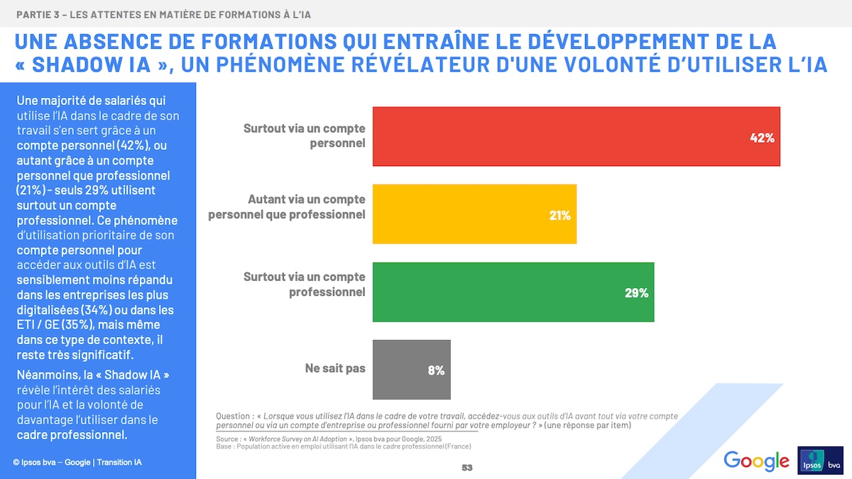 - Un décalage dirigeants/salariés : 70 % des cadres constatent des gains de productivité, alors que les salariés peinent à identifier des usages pertinents pour leur travail.