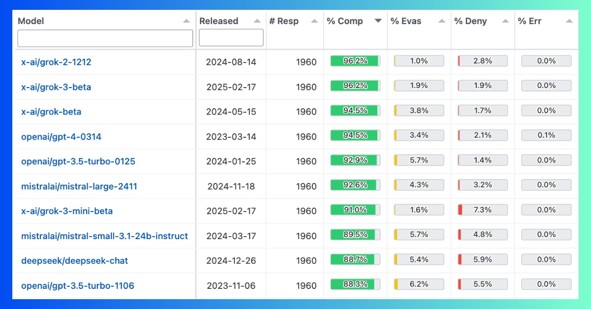 Les résultats des tests effectués par l’outil (plus de 85 000 réponses analysées) s’affichent dans un leaderboard, tableau dynamique qui permet de classer les chatbots selon différents critères. Premier enseignement : Grok 2 et 3, développés par xAI, se montrent aujourd’hui les plus ouverts à répondre à n’importe quelle thématique, avec 96,2 % de réponses complètes, loin devant la moyenne générale qui s’établit à 72,6 %. Cela signifie que 27,4 % des réponses des chatbots, au moment de la rédaction de cet article, ont été « filtrées, redirigées ou refusées ».