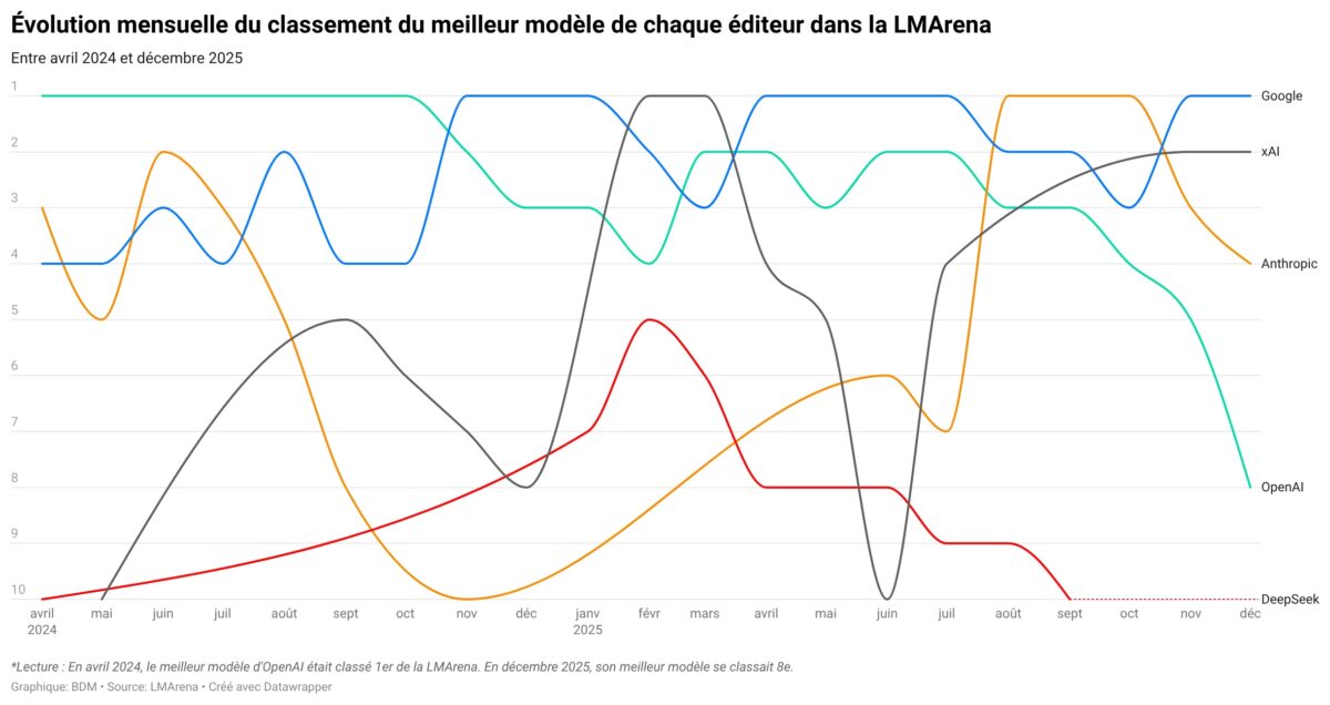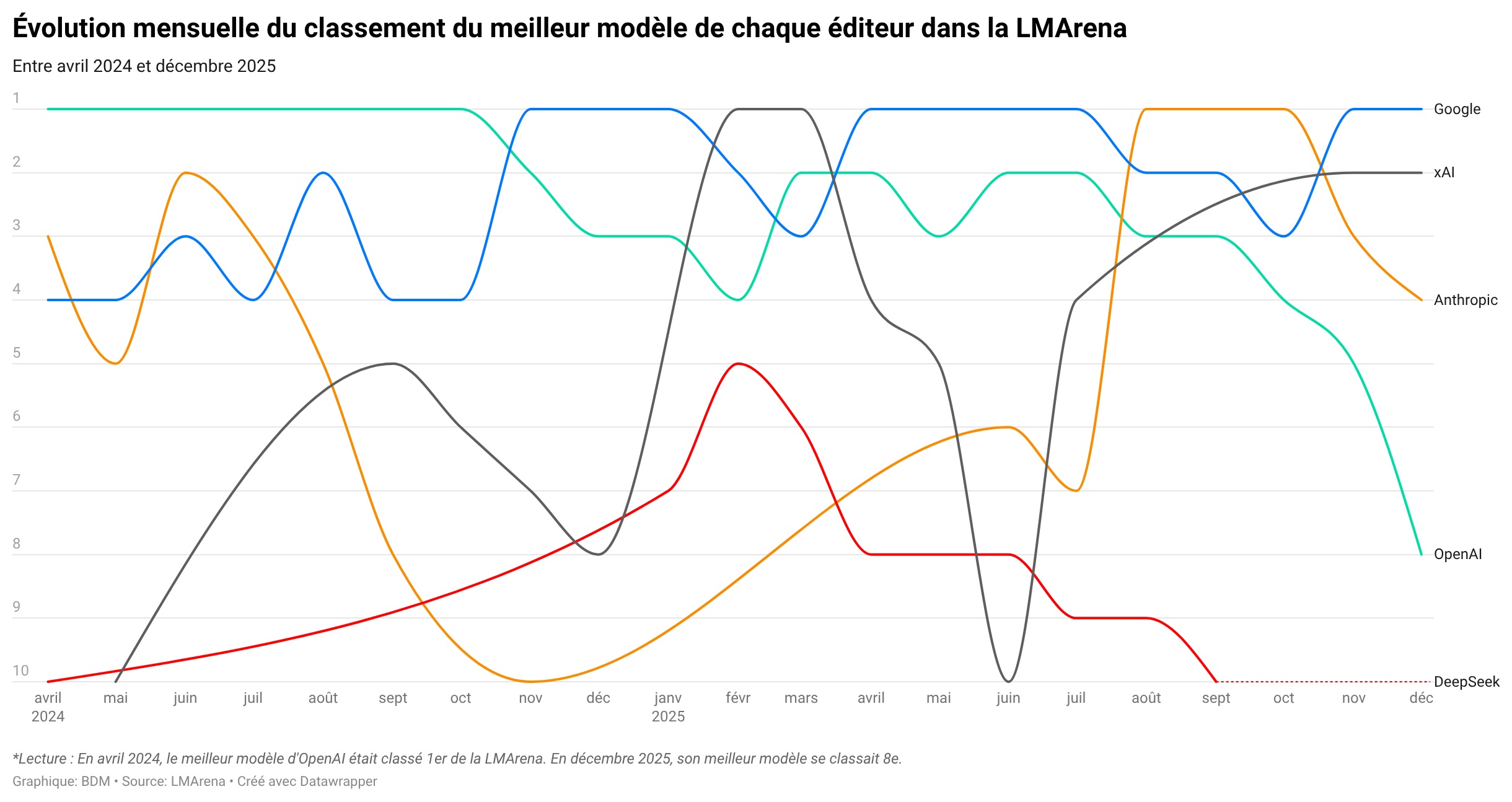 Si OpenAI reste le plus présent dans les classements, l’entreprise ne parvient plus à placer ses modèles au sommet. Entre novembre 2024 et décembre 2025, Google a trusté la première place à neuf reprises, contre sept pour OpenAI sur toute la période. Début 2025, xAI s’offrait deux premières places, contre trois pour Anthropic à la fin de l’année. Mais au-delà de ce simple décompte, c’est l’évolution dans le temps qui révèle l’ampleur du basculement. En avril 2024, le meilleur modèle d’OpenAI occupait la première position du classement. En décembre 2025, il a dégringolé à la huitième place.