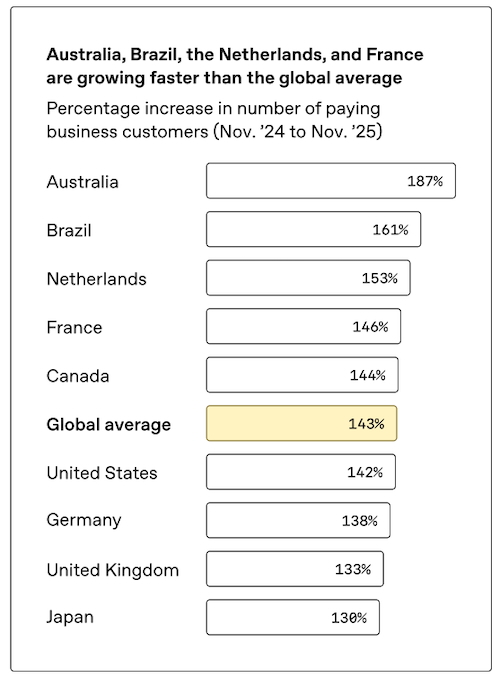 Sur le plan géographique, l’adoption s’accélère fortement en dehors des États-Unis. Parmi les principaux marchés, l’Australie affiche la croissance la plus rapide avec 187 % d’augmentation du nombre de clients payants entre novembre 2024 et novembre 2025, suivie par le Brésil (161 %), les Pays-Bas (153 %) et la France (146 %), soit plus que la moyenne mondiale (143 %).