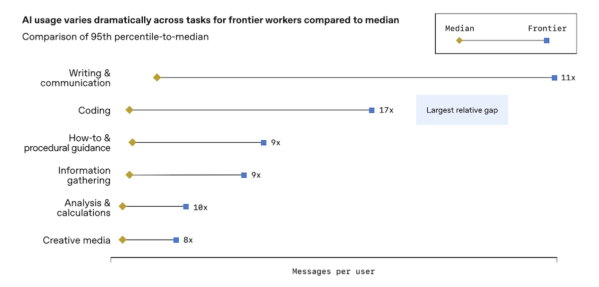Le rapport pointe un écart grandissant entre les utilisateurs/entreprises les plus avancés et la médiane. Les travailleurs les plus intensifs dans leur usage de l’IA, ceux qui se situent dans le top 5 % des utilisateurs qu’OpenAI appelle les utilisateurs « frontières », envoient 6 fois plus de messages que l’utilisateur médian. Dans les fonctions d’analyse de données, ils utilisent l’outil d’analyse 16 fois plus que la médiane. Au niveau des tâches, l’écart est particulièrement marqué sur le code. Les utilisateurs frontières envoient 17 fois plus de messages de codage que la médiane. Pour l’écriture et la communication, le ratio atteint 11, et 10 pour l’analyse et les calculs.