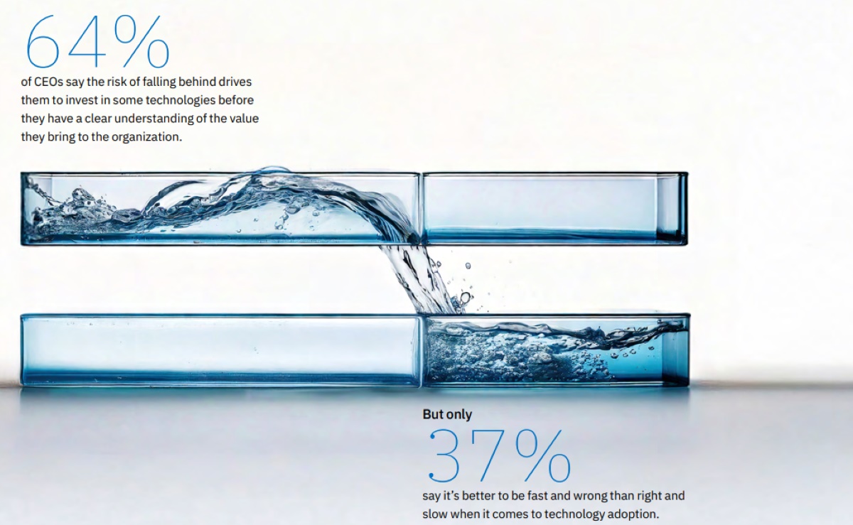 La principale raison à cette précipitation est la peur de se faire distancer par les concurrents. 64 % des dirigeants interrogés reconnaissent que le risque de rester à la traîne « les pousse à investir dans certaines technologies avant même d’avoir une compréhension claire de ce qu’elles apportent à l’entreprise« . Malgré cela, il n’y a que 37 % d’entre eux qui déclarent qu’il vaut mieux être rapide et prendre des risques plutôt que d’être prudent et de prendre son temps.