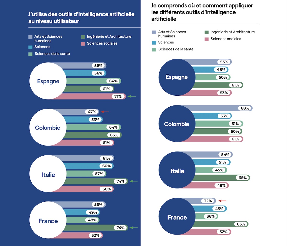 En France et en Italie, les étudiants en Ingénierie et en Architecture sont les plus nombreux à utiliser l’IA au niveau utilisateur (74 %), tandis qu’en Espagne, ce sont ceux en Sciences sociales qui l’adoptent le plus (71 %). À l’inverse, en Colombie, les étudiants en Arts et Sciences humaines affichent un taux d’utilisation plus faible (47 %). Par ailleurs, la France se distingue par un faible niveau de compréhension des applications de l’IA, en particulier parmi les étudiants en Arts et Sciences humaines (32 %).
