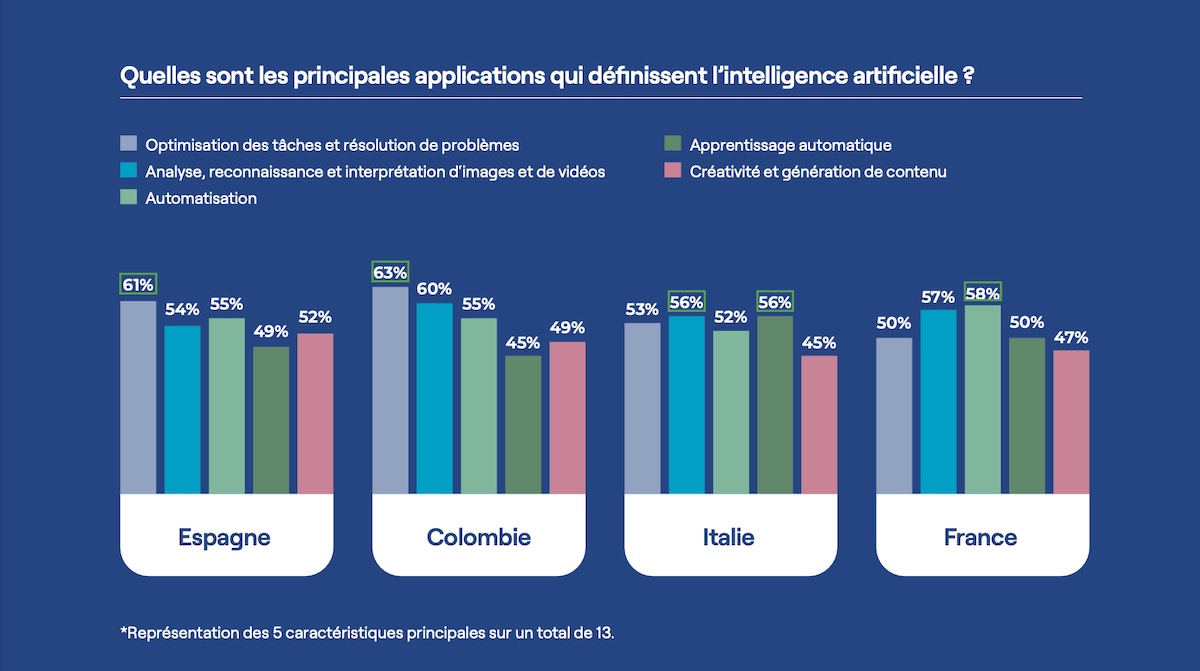 L’optimisation des tâches et l’analyse des images sont les deux applications les plus reconnues de l’intelligence artificielle, avec quelques particularités selon les pays : l’Italie identifie également l’apprentissage automatique comme la principale caractéristique de l’IA, tandis que la France l’associe principalement à l’automatisation, note l’étude.