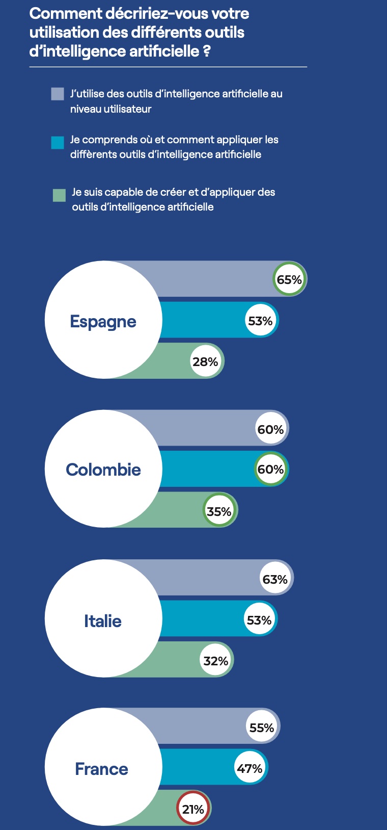 Autre point préoccupant : le manque de confiance des étudiants français dans leur capacité à apprendre l’IA. Seulement 40 % d’entre eux se disent confiants dans leur aptitude à acquérir les connaissances nécessaires pour travailler avec l’IA, contre 65 % en Colombie et en Espagne. Ces chiffres montrent que les étudiants français sont moins préparés à relever les défis de l’IA et que le système éducatif peine encore à leur fournir les outils nécessaires pour combler ce déficit.