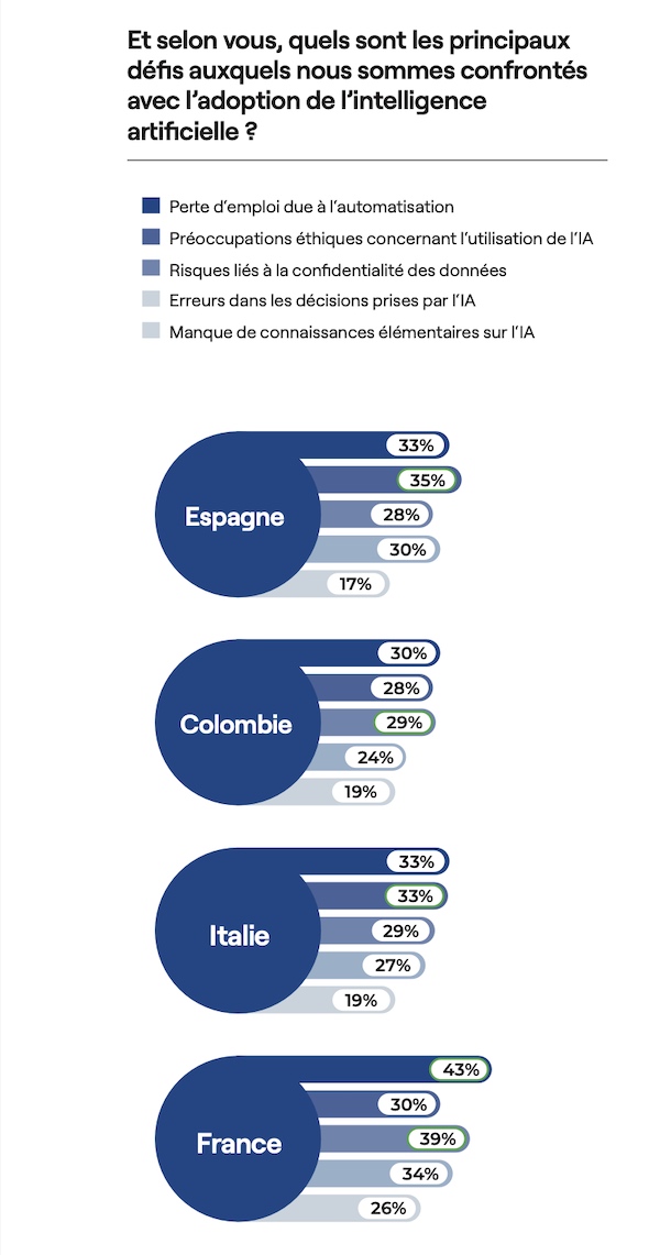 Si la perte d’emplois due à l’IA est une inquiétude partagée dans tous les pays étudiés, elle est particulièrement marquée en France. 43 % des étudiants français estiment que l’IA entraînera une destruction massive d’emplois, contre 33 % en Espagne, 33 % en Italie et 30 % en Colombie.