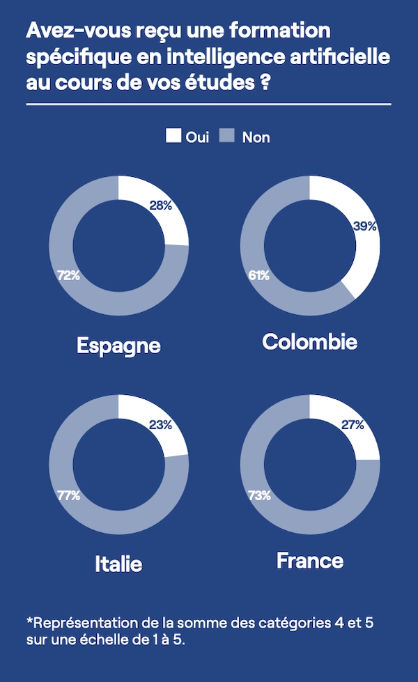 Un des principaux facteurs expliquant le retard français dans l’adoption proactive de l’IA est le manque de formation. L’étude révèle que 73 % des étudiants français déclarent ne pas avoir reçu de formation en IA, contre 77 % en Italie, 72 % en Espagne et 61 % en Colombie. La Colombie se distingue donc avec un taux de formation plus élevé (39 % des étudiants déclarent avoir été formés à l’IA, contre seulement 27 % en France).