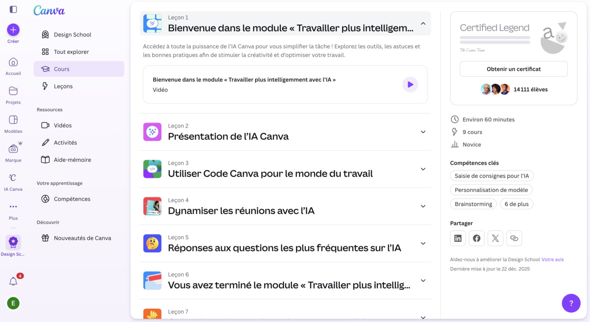 Canva propose sur sa Design School plusieurs formations gratuites et certifiantes liées à l’IA, disponibles en français. Parmi elles, un parcours destiné aux novices pour apprendre à « travailler plus intelligemment avec l’IA » ou encore un cours dédié aux workflows IA avec la Suite Studio, qui permet d’automatiser une partie du travail de création visuelle.