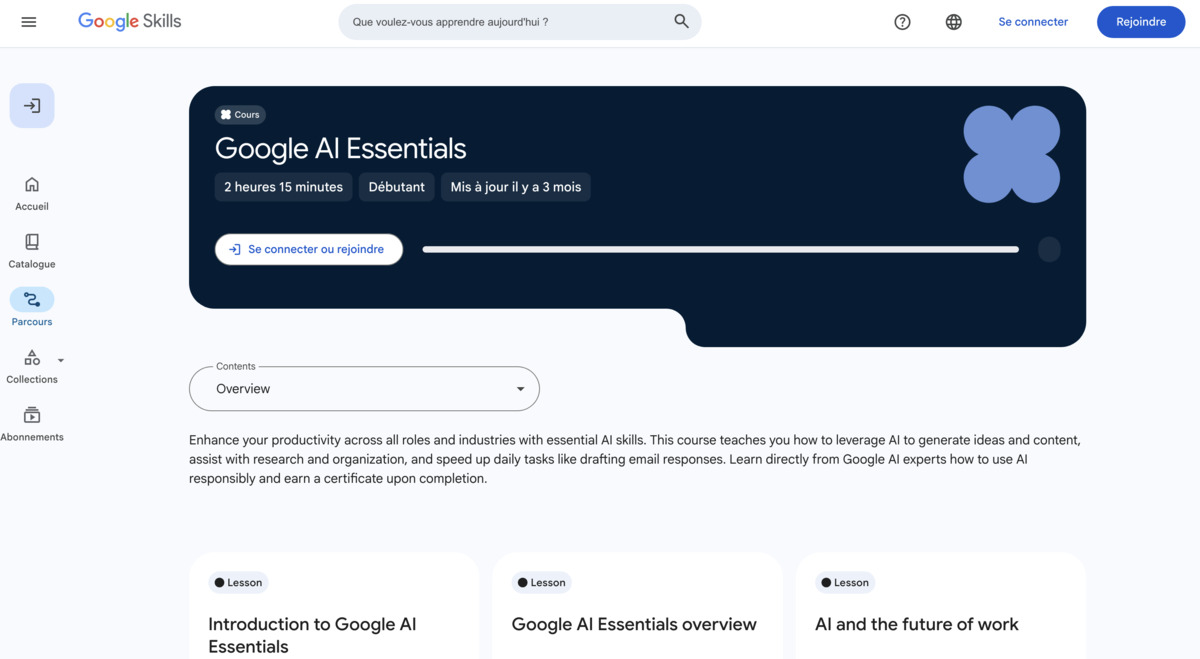 Google propose un large catalogue de formations gratuites sur sa plateforme Google Skills. On y retrouve notamment Google AI Essentials, un cours entièrement gratuit et en anglais qui couvre les fondamentaux de l’IA, l’utilisation d’outils génératifs, l’art du prompting et l’usage responsable de l’IA, sans aucun prérequis.