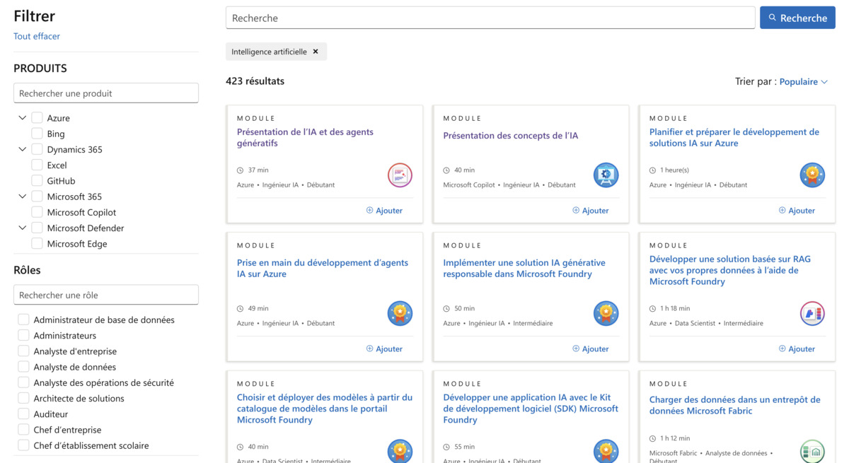 Microsoft Learn propose de nombreux modules gratuits et en anglais sur l’IA, adaptés à tous les niveaux (débutant, intermédiaire, avancé). Les parcours couvrent aussi bien l’utilisation de Copilot au quotidien que le développement d’applications IA avec Azure, en passant par la stratégie IA pour les dirigeants. Chaque formation précise les métiers visés, et certaines débouchent sur des certifications Microsoft reconnues.
