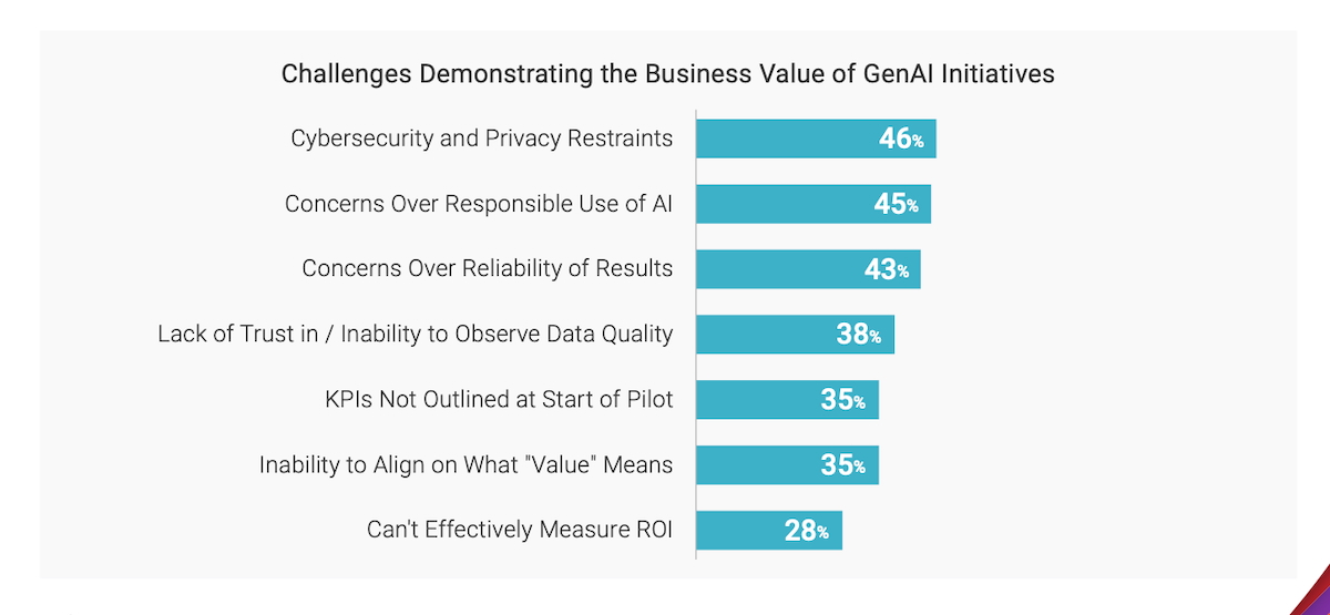 L’absence de KPI définis dès le lancement (35 %) et l’incapacité à s’accorder sur ce que signifie la « valeur » (35 %) ont freiné la démonstration de l’importance des initiatives GenAI.