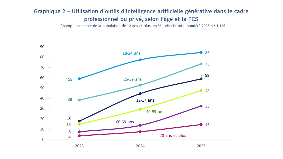 L’adoption de l’IA générative varie considérablement selon les profils. Les 18-24 ans sont les plus fervents utilisateurs avec 85 % d’entre eux qui déclarent y recourir, suivis par les indépendants (77 %), les cadres et professions intellectuelles supérieures (76 %) et les 25-39 ans (73 %). Les adolescents de 12 à 17 ans ne sont pas en reste avec 59 % d’utilisateurs. À l’opposé, seuls 15 % des 70 ans et plus utilisent ces outils, creusant un écart de 70 points avec les jeunes adultes, contre 55 points deux ans plus tôt. La fracture générationnelle s’accentue donc à mesure que la technologie se diffuse.