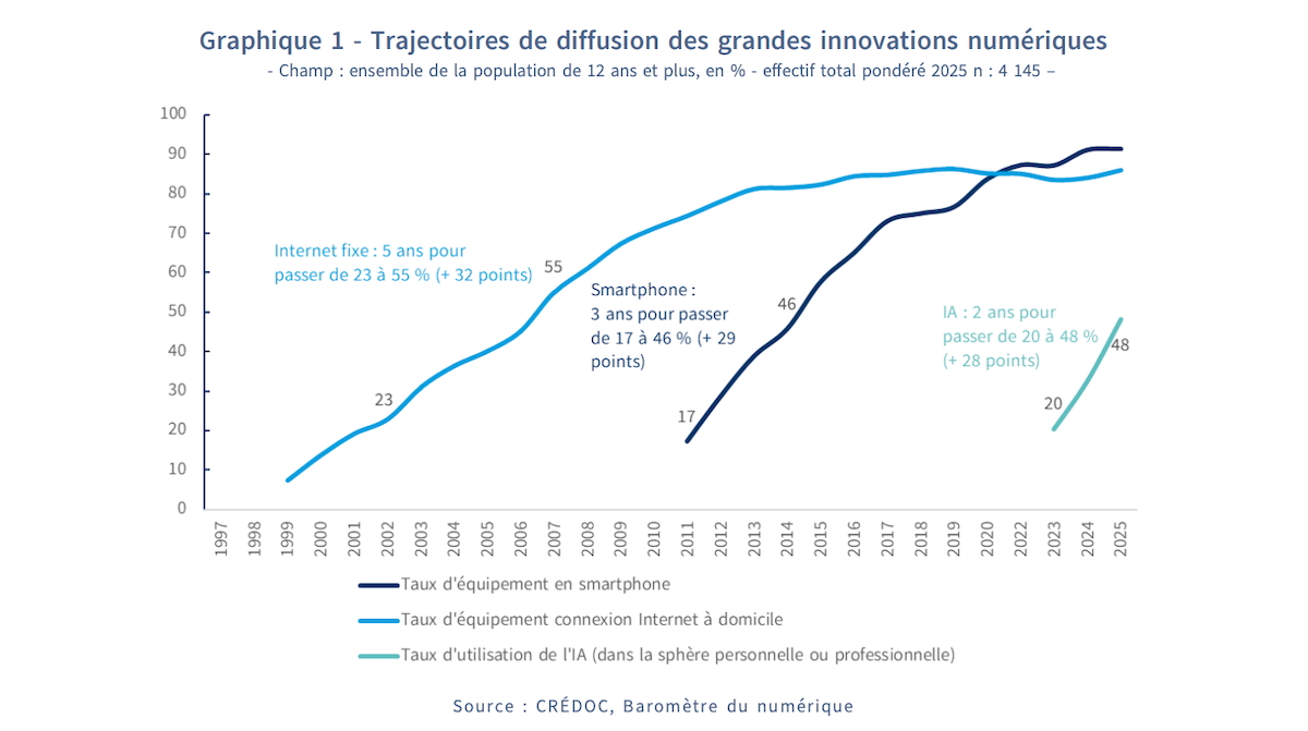 L’édition 2026 du Baromètre du numérique, réalisée par le CRÉDOC pour l’Arcep, l’Arcom, le CGE et l’ANCT, dresse un constat sans équivoque : l’IA générative s’est imposée dans le quotidien des Français à une vitesse inédite. Alors qu’un cinquième de la population y avait recours en 2023 (20 %), ce chiffre atteint aujourd’hui 48 %, soit une progression de 28 points en deux ans. Cette trajectoire dépasse celle de toutes les vagues technologiques précédentes. En effet, la connexion Internet à domicile avait mis cinq ans pour atteindre un niveau comparable, le smartphone trois ans.