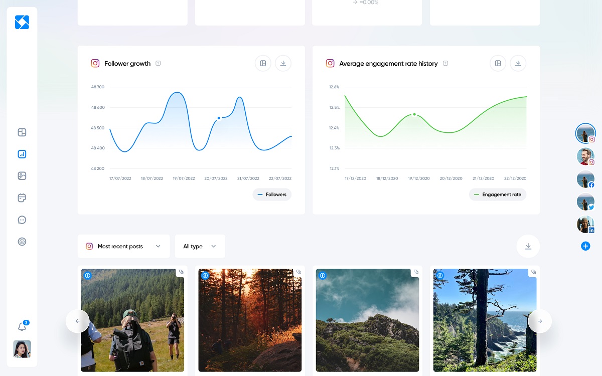 Doté d’une interface visuelle, simple et intuitive, Iconosquare intègre sur une seule et même plateforme l’ensemble de vos comptes : Instagram, TikTok, LinkedIn, Twitter et Facebook. Vous connectez vos profils en quelques clics, et vous avez la possibilité de naviguer facilement d’un compte à un autre au sein d’un tableau de bord que vous pouvez personnaliser à votre guise. L’outil apporte un gain de temps indéniable pour gérer la présence social media de plusieurs dizaines, voire centaines de clients. Résultat : vous pouvez vous concentrer sur des missions à plus forte valeur ajoutée, comme la stratégie, la création et l’écriture de posts.